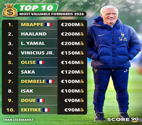 全球身價(jià)前十前鋒中,法國球員占半數(shù):