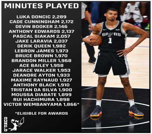 美記Nate Duncan列出了本賽季出場時間比文班亞馬多,但因65場規(guī)則沒有評獎資格的球員,按出場時間依次是東契奇、坎寧安、布克、愛德華茲、西亞卡姆、拉拉維亞、奎因、詹姆斯、布魯斯·布朗、布蘭登·米勒、貝利、賈雷斯·沃克、艾頓、雷諾、布萊克、席爾瓦、迪亞巴特、八村塁。