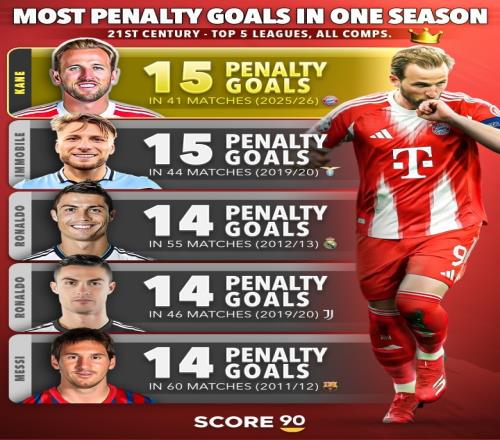 本世紀(jì)單賽季點(diǎn)球進(jìn)球排行凱恩以15球排名第一C羅和梅西各以14球緊隨其后_德甲直播