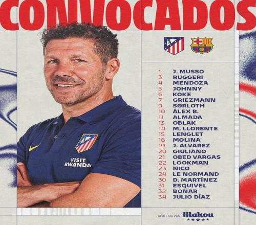 前鋒:7-格列茲曼、9-瑟洛特、10-巴埃納、11-阿爾馬達(dá)、19-阿爾瓦雷斯、20-朱利亞諾-西蒙尼、22-盧克曼、23-尼古拉斯-岡薩雷斯