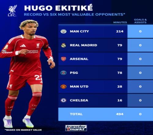 對于兩位總身價2.2億歐元的利物浦主力攻擊手來說,這個數(shù)據(jù)相當(dāng)嚇人,也說明他們在關(guān)鍵比賽中完全沒有發(fā)揮出應(yīng)有的作用。