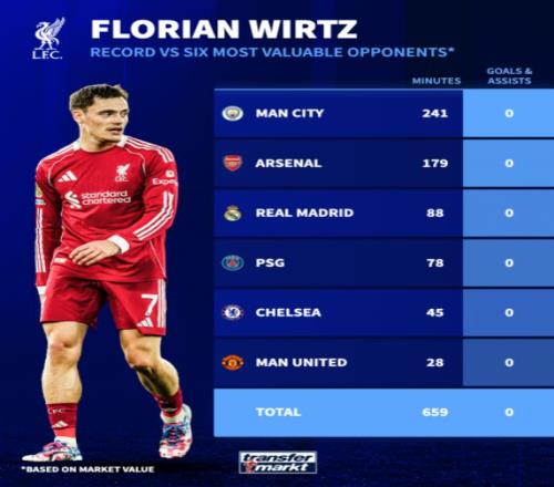 相比之下,?;倏吮举惣颈憩F(xiàn)稍好一些,44場比賽貢獻(xiàn)了23個進(jìn)球或助攻;而維爾茨則沒能復(fù)制他在德甲的出色狀態(tài)。