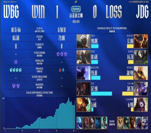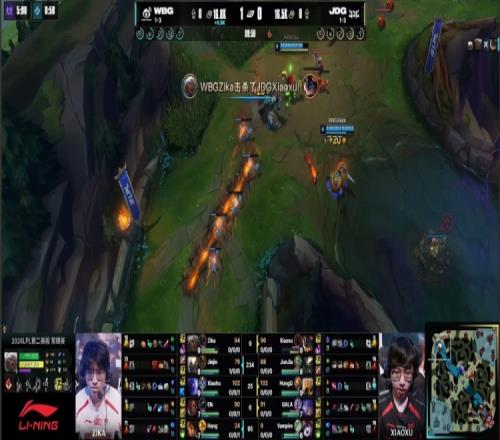 第一局前期WBG依靠中野聯(lián)動抓爆JDG三路打開局面,中期中路團戰(zhàn),hang米利歐未能解掉Junjia蝎子大招,致使Elk盧錫安被Junjia拉回?fù)魵ⅲ瑳]躲過就Elk盧錫安圣槍洗禮射爆GALA,Zika拿到生涯1000擊殺,WBG打出1換4吃掉大龍,經(jīng)濟領(lǐng)先8k。
