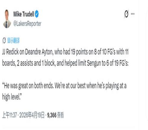 本賽季常規(guī)賽,艾頓一共14次得分20+,湖人戰(zhàn)績(jī)13勝1負(fù)。也就是說,頓寶砍下高分,湖人的勝率非常高。這也是為什么雷迪克說,當(dāng)艾頓打出高水平,湖人處在最強(qiáng)形態(tài)。