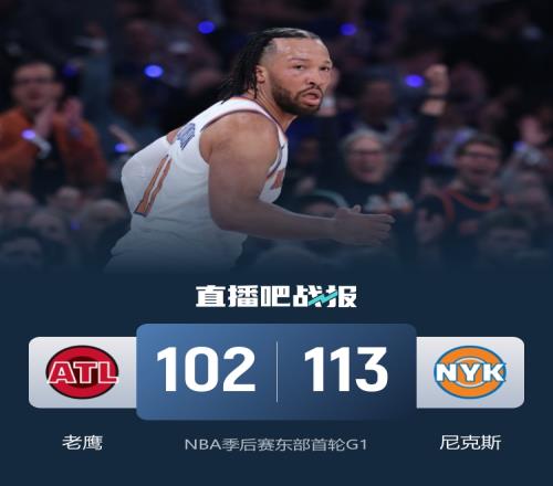 比賽開(kāi)始,雙方上來(lái)都快速進(jìn)入狀態(tài),布倫森里突外投連砍12分,杰倫·約翰遜外線能接連回應(yīng),隨后布倫森繼續(xù)取分單節(jié)攬19分,尼克斯首節(jié)領(lǐng)先6分,次節(jié)麥科勒姆站出來(lái)里突外投單節(jié)12分帶隊(duì)追分,尼克斯也能給出回應(yīng),雙方展開(kāi)拉鋸戰(zhàn),奧孔武壓哨三分追到差2分。下半場(chǎng),雙方展開(kāi)拉鋸戰(zhàn),阿努諾比崴腳無(wú)礙后老鷹砍米切爾·羅賓遜,雙方連續(xù)走上罰球線,三節(jié)尼克斯重新領(lǐng)先9分,末節(jié)庫(kù)明加連續(xù)強(qiáng)沖內(nèi)線追分,但唐斯里突外投連得6分回應(yīng),隨后尼克斯再轟10-0拉開(kāi)近20分領(lǐng)先,但老鷹連續(xù)3記三分回應(yīng)11-0,最終尼克斯113-102擊退老鷹,大比分1-0領(lǐng)先。