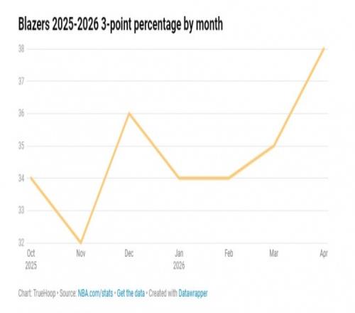 最近觀看開(kāi)拓者的比賽,似乎他們的三分球正在改善,這不是偶然現(xiàn)象。在籃球數(shù)據(jù)網(wǎng)站上,我發(fā)現(xiàn)開(kāi)拓者在82場(chǎng)比賽中有17場(chǎng)三分命中率超過(guò)40%。他們?cè)谶@些比賽中取得了14勝3負(fù)的成績(jī),很多勝利都是在賽季末取得的。這可能不是隨機(jī)現(xiàn)象。