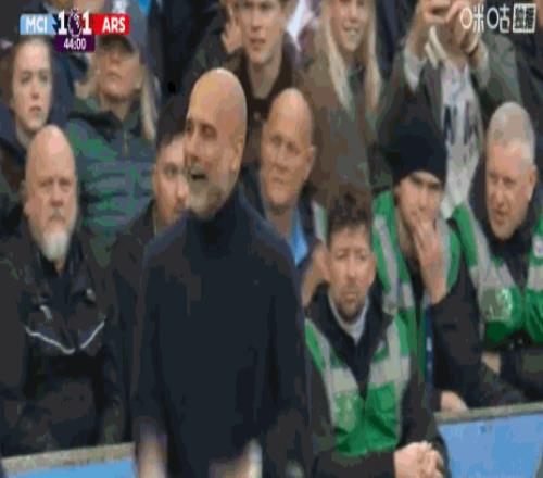 第45分鐘,不滿邊線球判罰,瓜迪奧拉場邊無奈表示