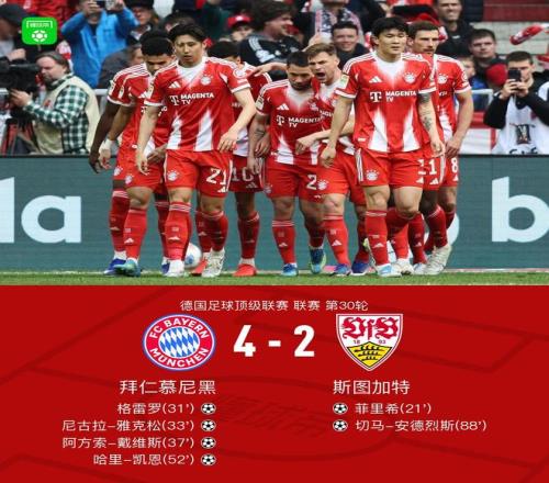 北京時間4月19日德國足球頂級聯(lián)賽 聯(lián)賽 第30輪,拜仁慕尼黑主場對陣斯圖加特。拜仁慕尼黑格雷羅破門,尼古拉-雅克松破門,阿方索-戴維斯破門,哈里-凱恩破門。斯圖加特菲里希破門,切馬-安德烈斯破門。最終比分拜仁 4-2 斯圖加特。