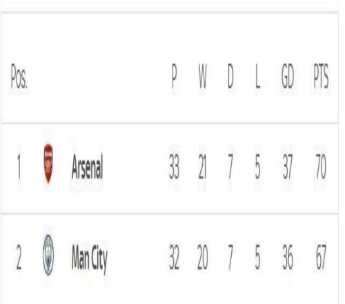 33輪之后,阿森納以70分繼續(xù)領(lǐng)跑,但少賽一場(chǎng)的曼城只落后3分。同時(shí),阿森納的凈勝球?yàn)?7球,而曼城為36球。
