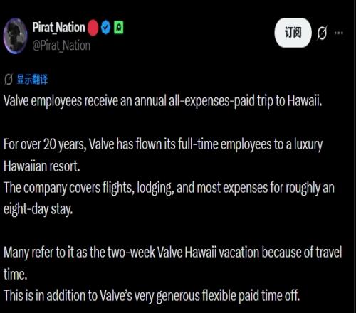近日,游戲博主@Pirat_Nation發(fā)文稱,Valve長(zhǎng)期為員工提供一項(xiàng)頗具吸引力的福利——每年一次全額報(bào)銷(xiāo)的夏威夷豪華度假。