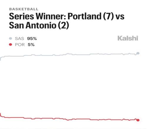 賽后預(yù)測平臺Kalshi Sports更新了這輪系列賽晉級概率:馬刺95%,開拓者5%。
