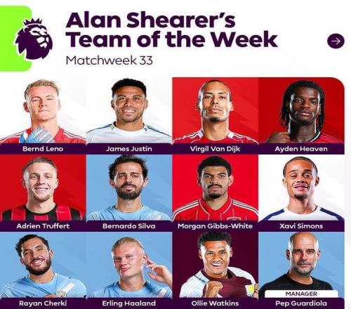 英超官方發(fā)布了阿蘭-希勒評選的本周英超最佳陣容,哈蘭德、謝爾基、范戴克、海文等人在列。